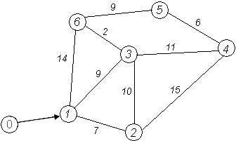 Алгоритм Дейкстры не может быть употреблен, если в графе имеются ребра с отрицательными весами. Будем, к примеру, в графе, приведенном на рис. 2, искать кратчайшие пути от вершины 1 до всех прочих вершин.