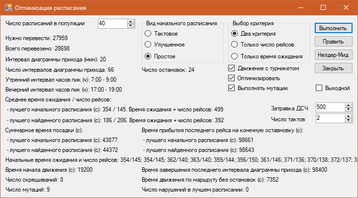 При движении с турникетами имеем следующие значения критериев:В случае тактовых расписаний [4] генетический алгоритм неприменим, поскольку и мутации, и перестройки расписания сделают начальное тактовое расписание не тактовым. Поэтому в приложение встроен код, обеспечивающий оптимизацию тактового расписания с помощью метода Неллдера-Мида [5].